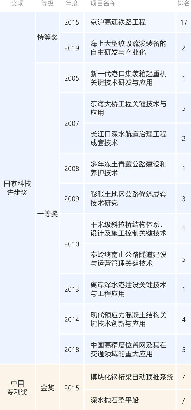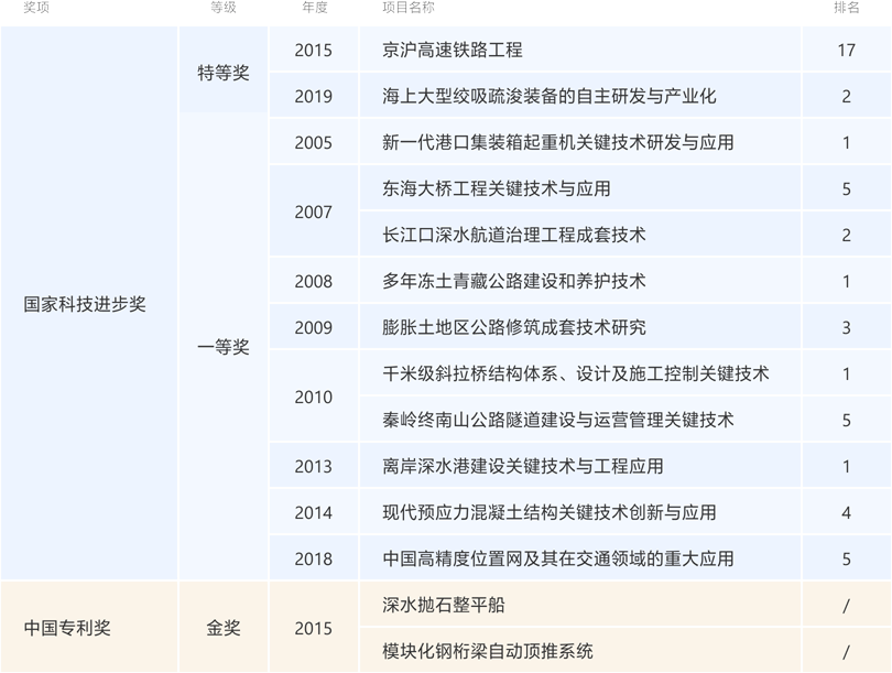 阻止2021年底,,,,,,公司获得国家科技前进奖特等奖2项,,,,,,一等奖10项,,,,,,二等奖34项;;;;;国家手艺发明奖二等奖5项。。。。。。。中国专利奖金奖2项,,,,,,优异奖34项。。。。。。。詹天佑奖108项。。。。。。。