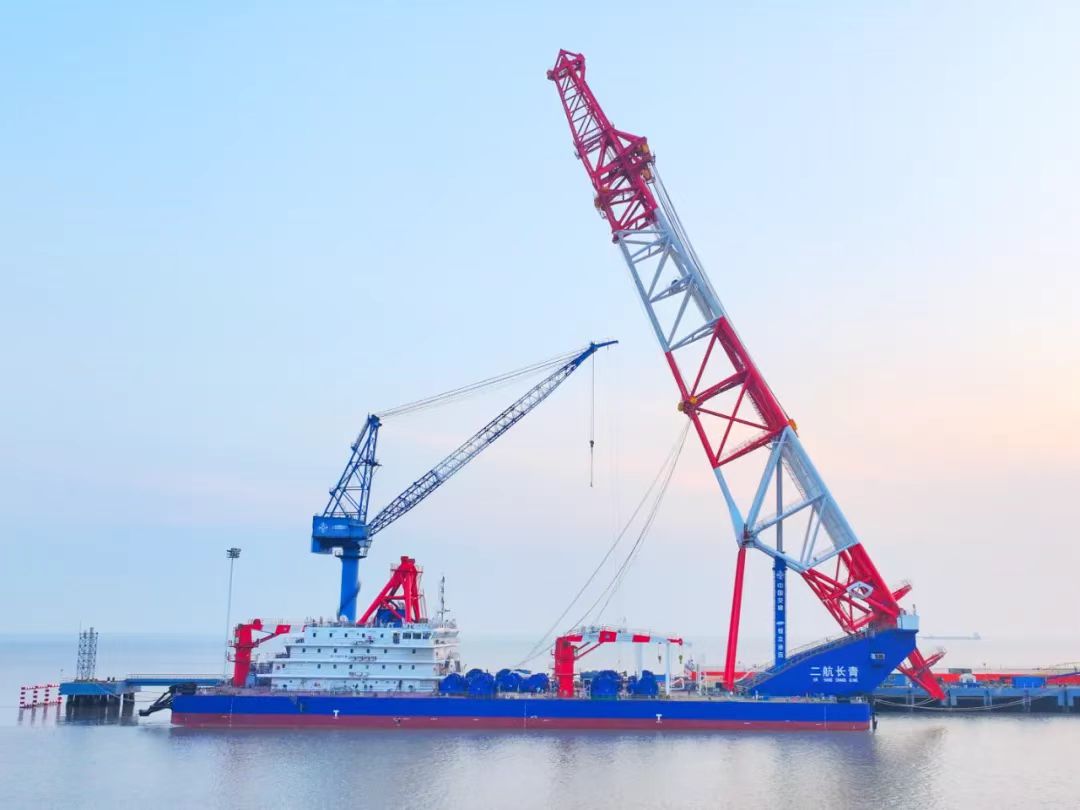 “二航长青”逾越“一航津桩”成为现在天下最大智能打桩船。。。。。。。。打桩船总长130.5米,,,,,,桩架高度150米,,,,,,可打最大桩重700吨、直径7米的桩基。。。。。。。。